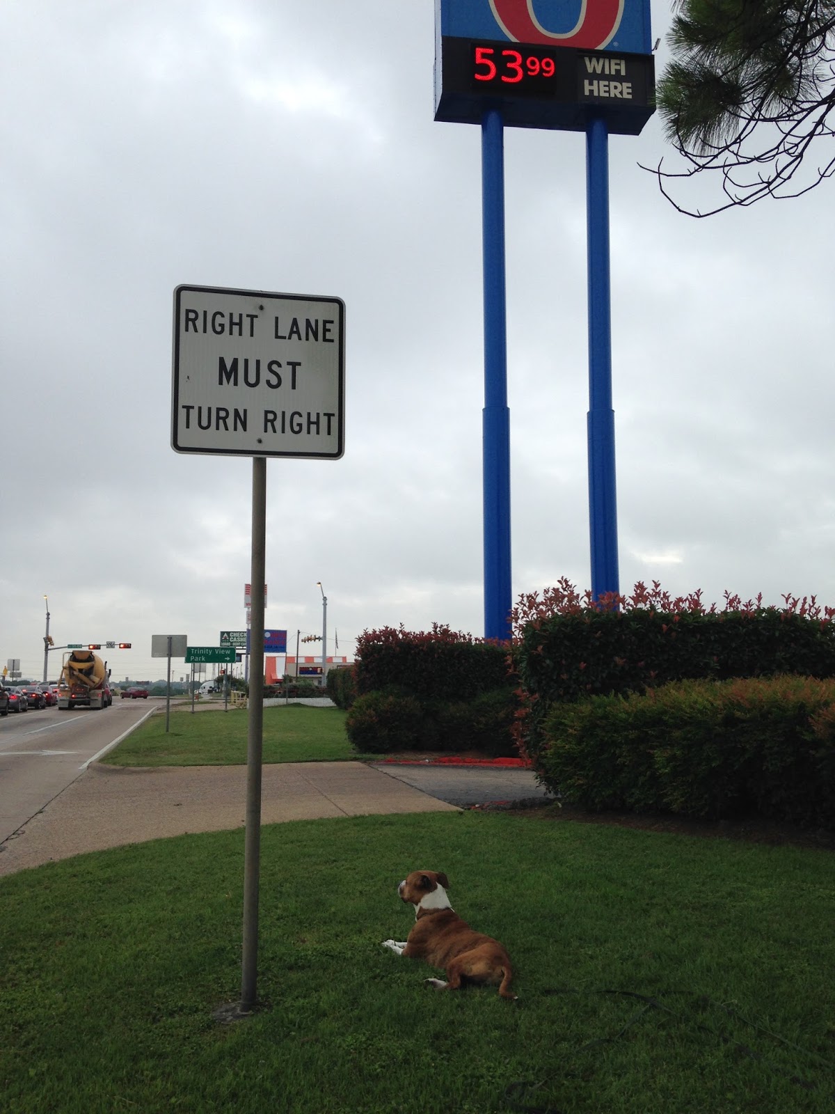 The parking situation here at the Motel 6 in Irving is unfortunate. There's a red line painted at the end of all the parking spaces; it says Fire Zone. The implication is that you aren't supposed to be hanging out past that line, so that a fire truck could get through if it needed to. But there are so many monster trucks here that even I, in my Mini Cooper, feel like I'm being crowded as I drive through it.